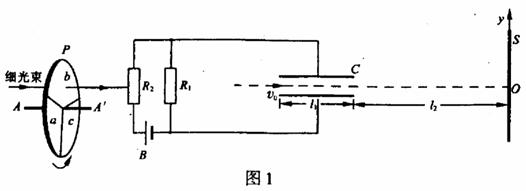 。P为一圆盘,由形状相同、透光率不同的三个扇形a 、b和c构成,它可绕AA'轴转动。当细光束通过扇形a 、b 、c照射光敏电阻R2时,R2的阻值分别为1000Ω、2000Ω、4500Ω。有一细电子束沿图中虚线以速度v0=8.0×106m/s 连续不断地射入C 。已知电子电量e=1.6×10-19C,电子质量m=9 ×10-31