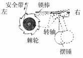 如图所示是一种汽车安全带控制装置的示意图,当汽车处于静止或匀速直线运动时,摆锤竖直悬挂,锁棒水平,棘轮可以自由转动,安全带能被拉动.当汽车突然刹车时,摆锤由于惯性绕轴摆动,使得锁棒锁定棘轮的转动,安全带不能被拉动.若摆锤从图中实线位置摆到虚线位置,汽车的可能运动方向和运动状态是 ( )