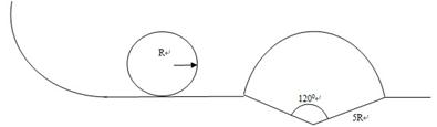 19.(10分)游乐场过山车可抽象为如下模型,从一定高度由静止滚下的质量为m小球、先经过一半径为R的圆轨道后再沿平直轨道冲上一半径为5R的圆弧,要求小球能安全地完成在轨道上运行,一切阻力不计。