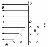 (16分)在xoy平面内,第Ⅲ象限内的直线OM是电场与磁场的边界,OM与负x轴成45°角。在x<0且OM的左侧空间存在着负x方向的匀强电场E,场强大小为0.32N/C,在y<0且OM的右侧空间存在着垂直纸面向里的匀强磁场B,磁感应强度大小为0.1T,如图所示。一不计重力的带负电微粒,从坐标原点O沿y轴负方向以v0=2×103m/s的初速度进入磁场,已知微粒的带电量为q=5×10-18C,质量为m=1×10-24kg,求: