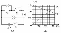 14. 两位同学在实验室中利用如图(a)所示的电路测定定值电阻R0、电源的电动势E和内电阻r,调节滑动变阻器的滑动触头P向某一方向移动时,一个同学记录的是电流表A和电压表V1的测量数据,另一同学记录的是电流表A和电压表V2的测量数据.并根据数据描绘了如图(b)所示的两条U-I图线.回答下列问题: