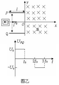 18.如图甲所示,建立Oxy坐标系,两平行极板P、Q垂直于y轴且关于x轴对称,极板长度和板间距均为l,第一四象限有磁场,方向垂直于Oxy平面向里。位于极板左侧的粒子源沿x轴向右连接发射质量为m、电量为+q、速度相同、重力不计的带电粒子。在0~3t0时间内两板间加上如图乙所示的电压(不考虑极板边缘的影响)。已知t = 0时刻进入两板间的带电粒子恰好在t0时刻经极板边缘射入磁场。上述m、q、l、t0、B为已知量。(不考虑粒子间相互影响及返回板间的情况)求: