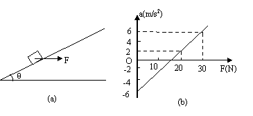如图(a)所示,用一水平外力F拉着一个静止在倾角为θ的光滑斜面上的物体,F随时间均匀增大,物体做变加速运动,其加速度a随外力F变化的图像如图(b)所示,若重力加速度g取10m/s2.根据图(b)中所提供的信息可以计算出( )