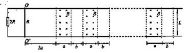 ,棒与导轨的接触电阻不计。导轨左端连有阻值为2R的电阻。轨道平面上有n段竖直向下的宽度为a、间距为b的匀强磁场(a>6),磁感应强度为B。金属棒初始位于OO’处,与第一段磁场相距2a。求: