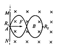 如图所示,在磁感应强度为B=2T,方向垂直纸面向里的匀强磁场中,有一个由两条曲线状的金属导线及两电阻(图中黑点表示)组成的固定导轨,两电阻的阻值分别为R1=3Ω、R2=6Ω,两电阻的体积大小可忽略不计,两条导线的电阻忽略不计且中间用绝缘材料隔开,导轨平面与磁场垂直(位于纸面内),导轨与磁场边界(图中虚线)相切,切点为A,现有一根电阻不计、足够长的金属棒MN与磁场边界重叠,在A点对金属棒MN施加一个方向与磁场垂直、位于导轨平面内的并与磁场边界垂直的拉力F,将金属棒MN以速度v=5m/s匀速向右拉,金属棒MN与导轨接触良好,以切点为坐标原点,以F的方向为正方向建立x轴,两条导线的形状符合曲线方程