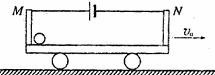 (20分)如图所示,在光滑水平地面上有一小车,车底板光滑且绝缘,车上左右两边分别竖直固定有金属板M、N,两板间的距离为L。M板接电源的正极,N板接电源的负极,两极板间的电场可视为匀强电场。一可视为质点的带正电小球,处在小车底板上靠近M板的位置并被锁定(球与M板不接触),小球与小车以速度v0共同向右运动。已知小球带电量为q,质量为m,车、金属板和电源的总质量为3m。某时刻突然解除对小球的锁定,在电场力的相互作用下,小球开始向右加速,小车向右减速,当小球刚要与小车的N板接触时,小车的速度恰好减为零。求:
