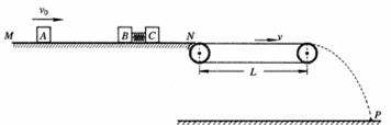 25、(18分)如图所示为某种弹射装置的示意图,光滑的水平导轨MN右端N处与水平传送带理想连接,传送带长度L=4.0m,皮带轮沿顺时针方向转动,带动皮带以恒定速率v=3.0m/s匀速传动。三个质量均为m=1.0kg的滑块A、B、C置于水平导轨上,开始时滑块B、C之间用细绳相连,其间有一压缩的轻弹簧,处于静止状态。滑块A以初速度v0=2.0m/s沿B、C连线方向向B运动,A与B碰撞后粘合在一起,碰撞时间极短,可认为A与B碰撞过程中滑块C的速度仍为零。因碰撞使连接B、C的细绳受扰动而突然断开,弹簧伸展,从而使C与A、B分离。滑块C脱离弹簧后以速度vC=2.0m/s滑上传送带,并从右端滑出落至地面上的P点。已知滑块C与传送带之间的动摩擦因数