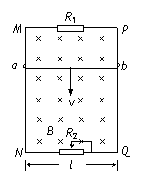 (2005年普通高等学校招生全国统一考试(天津卷)理科综合)(18分)图中MN和PQ为竖直方向的两平行长直金属导轨,间距l为0.40m,电阻不计。导轨所在平面与磁感应强度B为0.50T的匀强磁场垂直。质量m为6.0×10-3kg、电阻为1.0Ω的金属杆ab始终垂直于导轨,并与其保持光滑接触。导轨两端分别接有滑动变阻器和阻值为3.0Ω的电阻R1。当杆ab达到稳定状态时以速率v匀速下滑,整个电路消耗的电功率P为0.27W,重力加速度取10m/s2,试求速率v和滑动变阻器接入电路部分的阻值R2。