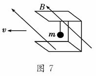 如图7所示,有一用铝板制成的U型框,将一质量为m 的带电小球用绝缘细线悬挂在框中,使整体在匀强磁场中沿垂直于磁场方向向左以速度v匀速运动,悬挂拉力为FT,则