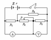 如图所示电路中,电源的内电阻为r,R1、R3、R4均为定值电阻,电表均为理想电表.闭合电键S,当滑动变阻器R2的滑动触头P向右滑动时,电表的示数都发生变化,下列说法错误的是 ( )