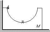14.(10分)如图所示,半径为R,内表面光滑的半球形容器放在光滑的水平面上,容器左侧靠着竖直墙壁,一个质量为m的小球,从容器顶端A无初速释放,小球能沿球面上升的最大高度距球面底部B的距离为3R/4,小球的运动在竖直平面内。求: