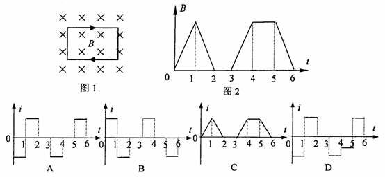 10.一矩形线圈位于一随时间t变化的匀强磁场内,设磁场方向垂直线圈所在的平面(纸面)向里为正,如图1所示,磁感应强度B随t的变化规律如图2所示。以i表示线圈中的感应电流,以图1中线圈上箭头所示方向的电流为正,则以下的i-t图中正确的是