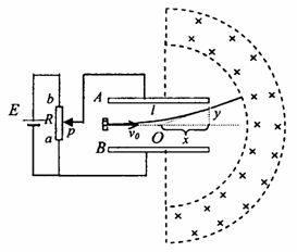 。在极板右侧有一个垂直纸面向里的匀强磁场,磁感应强度为B,分布在环带区域中,该环带的内外圆的圆心与两板问的中心重合于O点,环带的内圆半径为R1。当变阻器滑动触头滑至b点时,带电粒子恰能从右侧极板边缘射向右侧磁场。