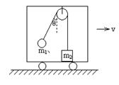 14、(8分)车厢顶部固定一定滑轮,在跨过定滑轮的绳子的两端各系一个物体,质量分别为m1、m2,且m1<m2 , m2静止在车厢地板上,当车厢向右运动时,系m1的那端绳子与竖直方向的夹角为θ,如图所示,此时,m1、m2及车保持相对静止。不计滑轮、绳子的质量和摩擦,求
