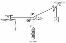 15.如下图所示,A、B都是重物,A被绕过小滑轮P的细线所悬挂,B放在粗糙的水平桌面上;滑轮P被一根斜短线系于天花板上的O点;O′是三根线的结点,bO′水平拉着B物体,cO′沿竖直方向拉着弹簧;弹簧、细线、小滑轮的重力和细线与滑轮间的摩擦力均可忽略,整个装置处于静止状态.若悬挂小滑轮的斜线OP的张力是20 N,取g=10 m/s2,。则下列说法中正确的是 ( )