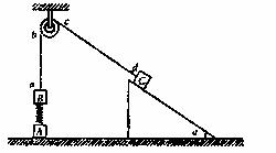 (14分)如图所示,在竖直方向上A、B物体通过劲度系数为k的轻质弹簧相连,A放在水平地面上,B、C两物体通过细绳绕过轻质定滑轮相连,C放在固定的光滑斜面上,用手拿住C,使细线刚刚拉直但无拉力作用,并保证ab段的细线竖直、cd段的细线与斜面平行,已知A、B的质量均为m,C的质量为4m,重力加速度为g,细线与滑轮之间的摩擦力不计,开始时整个系统处于静止状态,释放C后它沿斜面下滑,A刚离地面时,B获得最大速度。斜面足够长,求:
