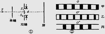 图①,为实验室所用的双缝干涉实验装置示意图,图②为用某种单色光进行实验时,在屏上观察到的条纹情况,其中O为中央亮纹,图中乙和丙图为把整个装置放入水中,可能观察到的条纹情况,O'、O''为对应的中央亮纹,则以下说法中正确的是( )