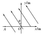 如图所示,空间有一匀强电场,场强大小一定,第1秒内场强方向如图所示,θ=37°,1 s后场强方向竖直向上。一带电小球以某一水平初速度从A点放出后恰沿x轴运动,1 s末到达坐标原点,若=4.75 m,求第2秒末该质点所处的位置坐标.(g= 10 m/s2)