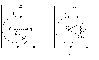 (16分)如图甲所示,在场强大小为E、方向竖直向下的匀强电场内存在一个半径为R的圆形区域,O点为该圆形区域的圆心,A点是圆形区域的最高点,B点是圆形区域最右侧的点.在A点由放射源释放出初速度大小不同、方向均垂直于