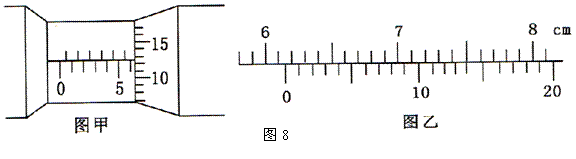 螺旋测微器测圆柱体的直径时,示数如图8甲所示,此示数_________mm;用分度为0.05mm的游标卡尺测量某物体的厚度时,示数如图8乙所示,此示数为___________cm。