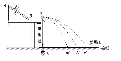 某同学用如图9所示的装置,利用两个大小相同的小球做对心碰撞来验证动量守恒定律,图中AB是斜槽,BC是水平槽,它们连接平滑,O点为重锤线所指的位置。实验时先不放置被碰球2,让球1从斜槽上的某一固定位置G由静止开始滚下,落到位于水平地面的记录纸上,留下痕迹,重复10次。然后将球2置于水平槽末端,让球1仍从位置G由静止滚下,和球2碰撞。碰后两球分别在记录纸上留下各自的痕迹,重复10次。实验得到小球的落点的平均位置分别为 M、N、P。