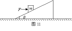 19、(6分)倾角为θ的斜面上有质量为m 的木块,它们之间的动摩擦因数为μ。现用水平力F推动木块,如图11所示,使木块恰好沿斜面向上做匀速运动。若斜面始终保持静止,求水平推力F的大小。