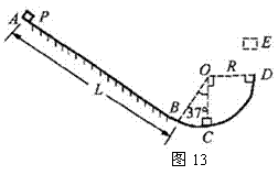 22、(9分)如图13所示,粗糙的斜面AB下端与光滑的圆弧轨道BCD相切于B,整个装置竖直放置,C是最低点,圆心角∠BOC=37º,D与圆心O等高.圆弧轨道半径R=0.5 m,斜面长L=2M.