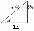 10.如图所示,有两根长为L、质量为m的细导体棒a、b,a被水平放置在倾角为45°的光滑斜面上,b被水平固定在与a在同一水平面的另一位置,且a、b平行,它们之间的距离为x.当两细棒中均通以电流大小为I的同向电流时,a恰能在斜面上保持静止,则下列关于b的电流在a处产生的磁场的磁感应强度的说法正确的是