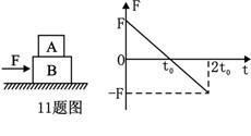 11.A、B两物体叠放在一起,放在光滑的水平面上,从静止开始受到一变力的作用,该力与时间的关系如图所示,A、B始终相对静止,则下列说法正确的是
