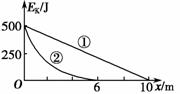 0.构建和谐型、节约型社会深得民心,遍布于生活的方方面面.自动充电式电动车就是很好的一例,电动车的前轮装有发电机,发电机与蓄电池连接.当在骑车者用力蹬车或电动自行车自动滑行时,自行车就可以连通发电机向蓄电池充电,将其他形式的能转化成电能储存起来.现有某人骑车以500 J的初动能在粗糙的水平路面上滑行,第一次关闭自充电装置,让车自由滑行,其动能随位移变化关系如图①所示;第二次启动自充电装置,其动能随位移变化关系如图线②所示,则第二次向蓄电池所充的电能是( A )