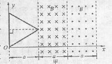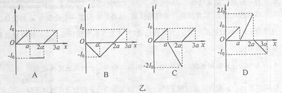 轴方向足够宽。现有一高为a的正三角形导线框从图示位置开始向右沿x轴方向匀速穿过磁场区域。若以逆时针方向为电流的正方向,在图乙中,线框中感应电流i与线框移动的位移x的关系图象正确的是 ( )
