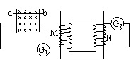 如图所示,足够长的两条平行金属导轨竖直放置,其间有与导轨平面垂直的匀强磁场,两导轨通过导线与检流计G1、线圈M接在一起。N是绕在“□”形铁芯上的另一线圈,它与检流计G2组成闭合回路。现有一金属棒ab沿导轨下滑,下滑过程与导轨接触良好,在ab下滑的过程中( )