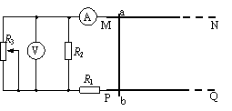 33.如图所示,MN和PQ是水平光滑的导轨,ab为垂直搁在导轨上的导体棒,它们的电阻都可忽略不计。竖直的匀强磁场穿过导轨平面,导轨的左端与一电路连接,图中R1=5Ω,R2=15Ω,R3为滑动变阻器,伏特表的量程为0~20V,安培表的量程为0~3A。请完成下列问题: