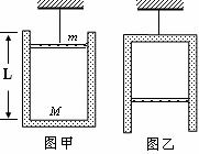 (10分)一个内壁光滑的圆柱形气缸,质量为M,高度为L,、底面积为S。缸内有一个质量为m的活塞,封闭了一定质量的理想气体,不计活塞厚度。温度为t0时,如果用绳子系住活塞将气缸悬挂起来,如图甲所示,气缸内气体柱的高为L1,如果用绳子系住气缸底,将气缸倒过来悬挂起来,如图乙所示,气缸内气体柱的高为L2,设两种情况下气缸都处于竖直状态,求: