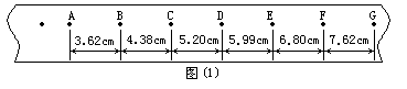 11. 某同学在“测匀变速直线运动的加速度”的实验中,用打点计时器记录了被小车拖动的纸带的运动情况,在纸带上确定出A、B、C、D、E、F、G共7个计数点.其相邻点间的距离如图(1)所示,每两个相邻的计数点之间的时间间隔为0.10s.