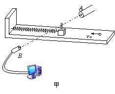 (式中k为弹簧的劲度系数,m为振子的质量,x为弹簧的形变量)。为了验证弹簧的弹性势能公式,他设计了如图甲所示的实验:轻弹簧的一端固定在水平光滑木板一端,另一端连接一个质量为M的滑块,滑块上竖直固定一个挡光条,每当挡光条挡住从光源A发出的细光束时,传感器B因接收不到光线就产生一个电信号,输入电脑后经电脑自动处理就能形成一个脉冲电压波形;开始时滑块静止在平衡位置恰好能挡住细光束。在木板的另一端有一个弹簧枪,发射出质量为m,速度为v0的一个弹丸,弹丸击中木块后留在木块中一起做简谐振动。