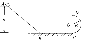 由斜面和圆形轨道分别与水平面相切连接而成的光滑轨道,圆形轨道的半径为R。质量为m的小物块从斜面上距水平面高为h=2.5R的A点由静止开始下滑,物块通过轨道连接处的B、C点时,无机械能损失。求: