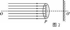 如图2所示,半径为R的圆形偏振片P的透振方向为竖直方向,一束横截面半径略小于R的平行自然光正对着偏振片P照射后射到屏上,现以光的传播方向OO / 为轴将偏振片P旋转90°,则在偏振片P旋转的过程中 ( )