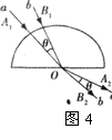 如图4所示,两柬不同靠单色光a和b,分别从A1、B1沿半径射人截面为半圆形的玻璃砖,经过圆心O后分别沿04,方向和0B2方向射出,且两入射光之间的夹角和两出射光之
