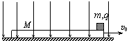 12.(10分)如图所示,在光滑的水平面上,有一竖直向下的匀强电场,电场强度E=1×103 V / m,一质量为M=20kg的足够长的木板,上表面粗糙,以速度v0=10 m / s向右做匀速直线运动。现将质量为m = 5 kg,带电量为q =-1×10-2 C的小铁块无初速地轻放在木板的前端,小铁块从放上木板到与木板以相同的速度共同运动所经历的时间为t = 2 s,g取10m/s2。求: