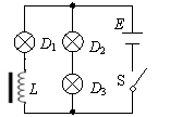 如图所示的电路中,L是一个自感系数很大、直流电阻不计的线圈,D1、D2和D3是三个完全相同的灯泡,E是内阻不计的电源。在t=0时刻,闭合开关S,电路稳定后在t1时刻断开开关S。规定以电路稳定时流过D1、D2的电流方向为正方向,分别用I1、I2表示流过D1和D2的电流,则下图中能定性描述电流I随时间t变化关系的是