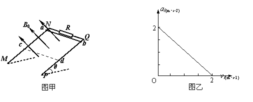 (16分)如图甲所示,MN、PQ为间距L=0.5m足够长的平行导轨,NQ⊥MN,导轨的电阻均不计。导轨平面与水平面间的夹角θ=37°,NQ间连接有一个R=4Ω的电阻。有一匀强磁场垂直于导轨平面且方向向上,磁感应强度为B0=1T。将一根质量为m=0.05kg的金属棒ab紧靠NQ放置在导轨上,且与导轨接触良好。现由静止释放金属棒,当金属棒滑行至cd处时达到稳定速度,已知在此过程中通过金属棒截面的电量q=0.2C,且金属棒的加速度a与速度v的关系如图乙所示,设金属棒沿导轨向下运动过程中始终与NQ平行。(取g=10m/s2,sin37°=0.6,cos37°=0.8)。求: