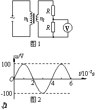 图1中的变压器为理想变压器,原线圈的匝数n1与副线圈的匝数n2之比为10 : 1。变压器的原线圈接如图2所示的正弦式电流,两个20Ω的定值电阻串联接在副线圈两端。电压表V为理想电表。则