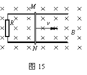 如图15所示,宽度为L=0.40 m的足够长的平行光滑金属导轨固定在绝缘水平面上,导轨的一端连接阻值为R=2.0Ω的电阻。导轨所在空间存在竖直向下的匀强磁场,磁感应强度大小为B=0.40 T。一根质量为m=0.1kg的导体棒MN放在导轨上与导轨接触良好,导轨和导体棒的电阻均可忽略不计。现用一平行于导轨的拉力拉动导体棒沿导轨向右匀速运动,运动速度v=0.50 m/s,在运动过程中保持导体棒与导轨垂直。求: