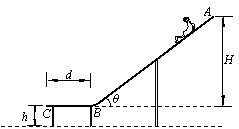 (10分)水上滑梯可简化成如图所示的模型,斜槽AB和水平槽BC平滑连接,斜槽AB的竖直高度H=6.0m,倾角θ=37°。水平槽BC长d=2.0m,BC面与水面的距离h=0.80m,人与AB、BC间的动摩擦因数均为μ=0.10。取重力加速度g=10m/s2,cos37°=0.8,sin37°=0.6。一小朋友从滑梯顶端A点无初速地自由滑下,求: