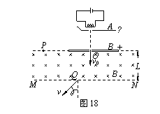 (8分)在水平放置的两块金属板AB上加上不同电压,可以使从炽热的灯丝释放的电子以不同速度沿直线穿过B板中心的小孔O进入宽度为L的匀强磁场区域,匀强磁场区域的磁感应强度为B,方向垂直纸面向里。若在A、B两板间加上电压U0时,电子不能穿过磁场区域而打在B板延长线上的P点,如图18所示。已知电子的质量为m,电荷量为e,并设电子离开A板时的初速度为零。