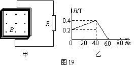 (10分)如图19甲所示,在一个正方形金属线圈区域内,存在着磁感应强度B随时间变化的匀强磁场,磁场的方向与线圈平面垂直。金属线圈所围的面积S=200cm2,匝数n=1000,线圈电阻r=1.0Ω。线圈与电阻R构成闭合回路,电阻R=4.0Ω。匀强磁场的磁感应强度随时间变化的情况如图19乙所示,求: