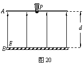 (10分)静电喷漆技术具有效率高,浪费少,质量好,有利于工人健康等优点,其装置示意图如图20所示。A、B为两块平行金属板,间距d=0.30m,两板间有方向由B指向A、电场强度E=1.0×103N/C的匀强电场。在A板的中央放置一个安全接地的静电油漆喷枪P,油漆喷枪的半圆形喷嘴可向各个方向均匀地喷出带电油漆微粒,油漆微粒的质量m=2.0×10-15kg、电荷量为q=-2.0×10-16C,喷出的初速度v0=2.0 m/s。油漆微粒最后都落在金属板B上。微粒所受重力和空气阻力以及微粒之间的相互作用力均可忽略。试求:
