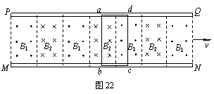 (12分)磁悬浮列车是一种高速运载工具,它由两个系统组成。一是悬浮系统,利用磁力使车体在轨道上悬浮起来从而减小阻力。另一是驱动系统,即利用磁场与固定在车体下部的感应金属线圈相互作用,使车体获得牵引力,图22就是这种磁悬浮列车电磁驱动装置的原理示意图。即在水平面上有两根很长的平行轨道PQ和MN,轨道间有垂直轨道平面的匀强磁场B1和B2,且B1和B2的方向相反,大小相等,即B1=B2=B。列车底部固定着绕有N匝闭合的矩形金属线圈abcd(列车的车厢在图中未画出),车厢与线圈绝缘。两轨道间距及线圈垂直轨道的ab边长均为L,两磁场的宽度均与线圈的ad边长相同。当两磁场Bl和B2同时沿轨道方向向右运动时,线圈会受到向右的磁场力,带动列车沿导轨运动。已知列车车厢及线圈的总质量为M,整个线圈的总电阻为R。