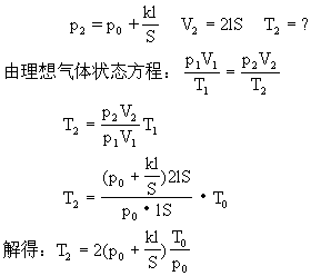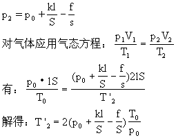 (2)当kl>f,对气缸缓慢加热到活塞移至缸筒口时,气缸内气体的温度又是多少?